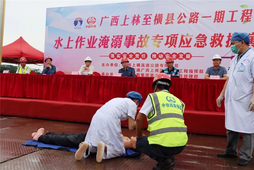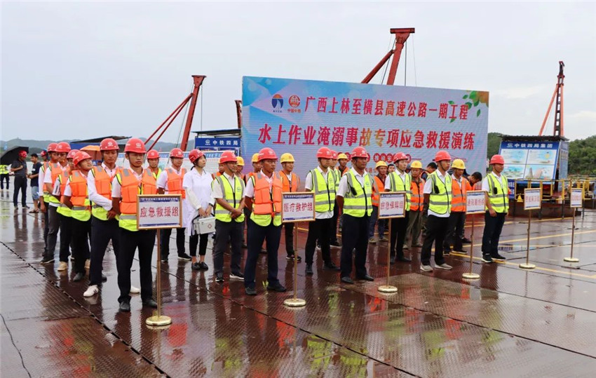 6月30日下午3時,上橫項(xiàng)目組織全線各項(xiàng)目部經(jīng)理、總工、安全總監(jiān)和安質(zhì)部長在西津郁江特大橋施工現(xiàn)場開展了水上作業(yè)淹溺事故專項(xiàng)應(yīng)急救援演練。本次演練邀請了橫州交通運(yùn)輸局、應(yīng)急管理局給予了現(xiàn)場指導(dǎo),橫州人民醫(yī)院、應(yīng)急救援大隊(duì),橫州鎮(zhèn)派出所、南寧高速、上橫項(xiàng)目有關(guān)人員,共計90余人參加現(xiàn)場演練。
