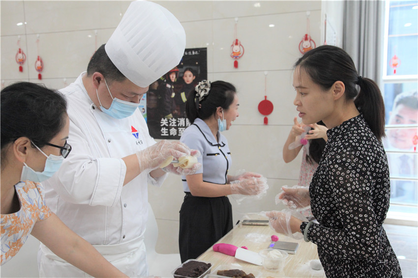 參加活動人員在專業烘焙老師的講解示范下,相互探討打月餅皮、揉餡、包月餅等環節,積極動手揉面、搟皮、包餡、整形,充分體驗到了制作月餅的快樂過程,呈現出了溫馨、和諧、團圓的喜慶氛圍。